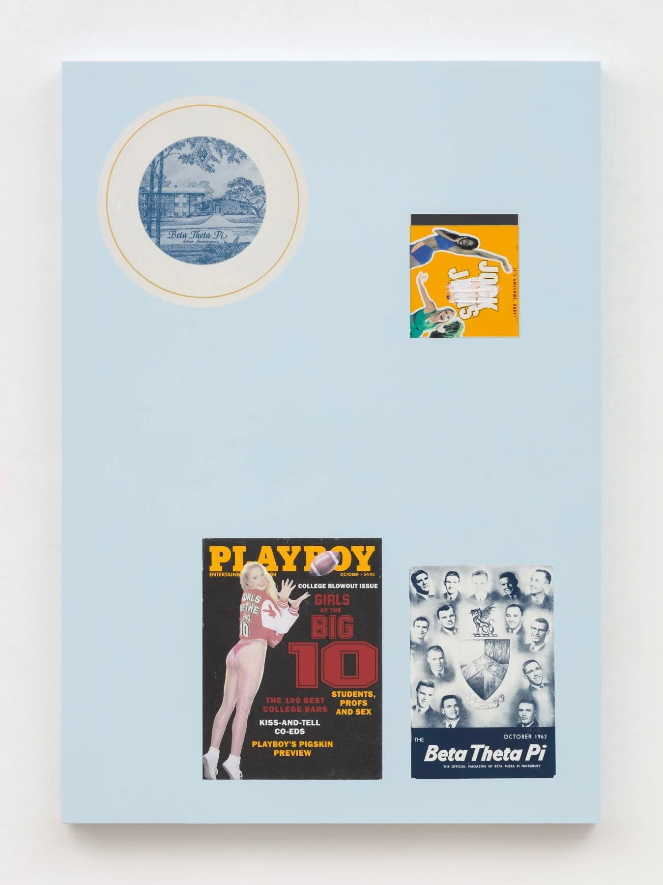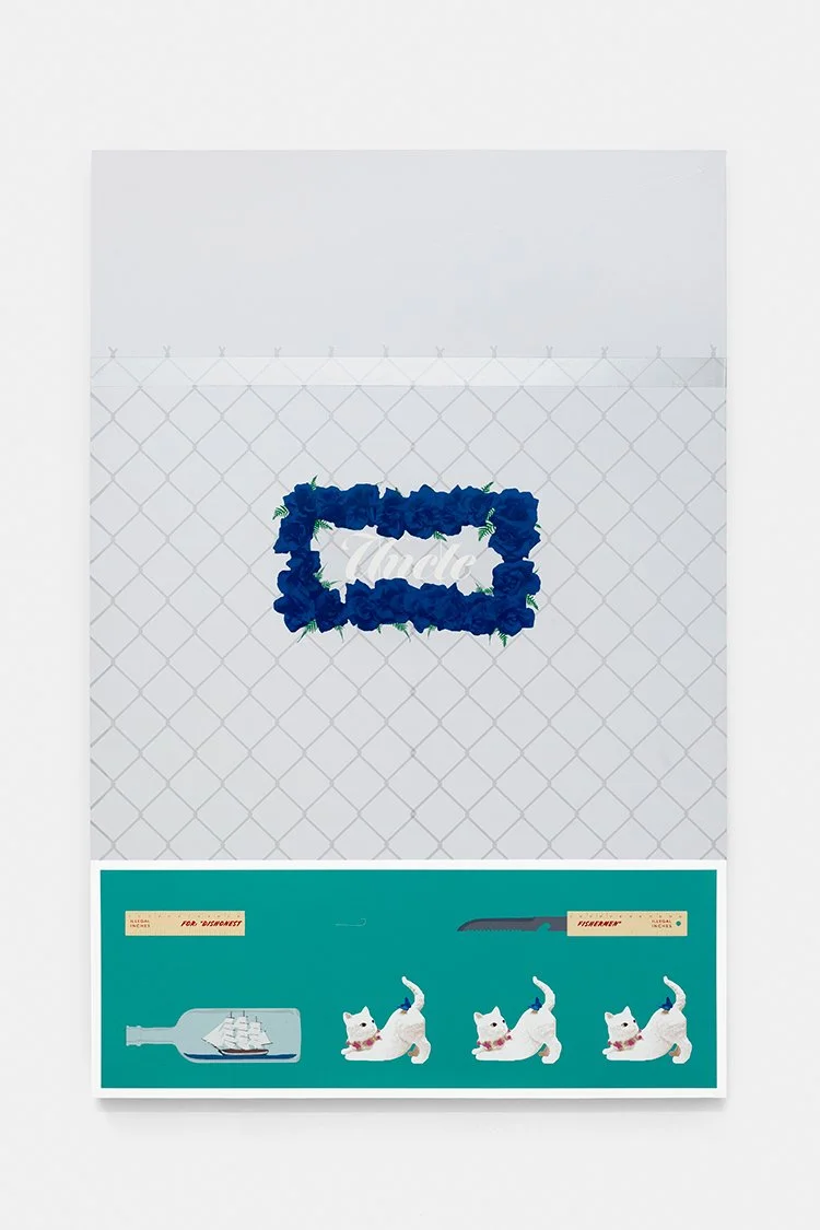 Acrylic on paper - found VHS cassette with silk screened acrylic on paper case with acrylic case - cast brass Battleship game token, 26” x 14.5” plus frame